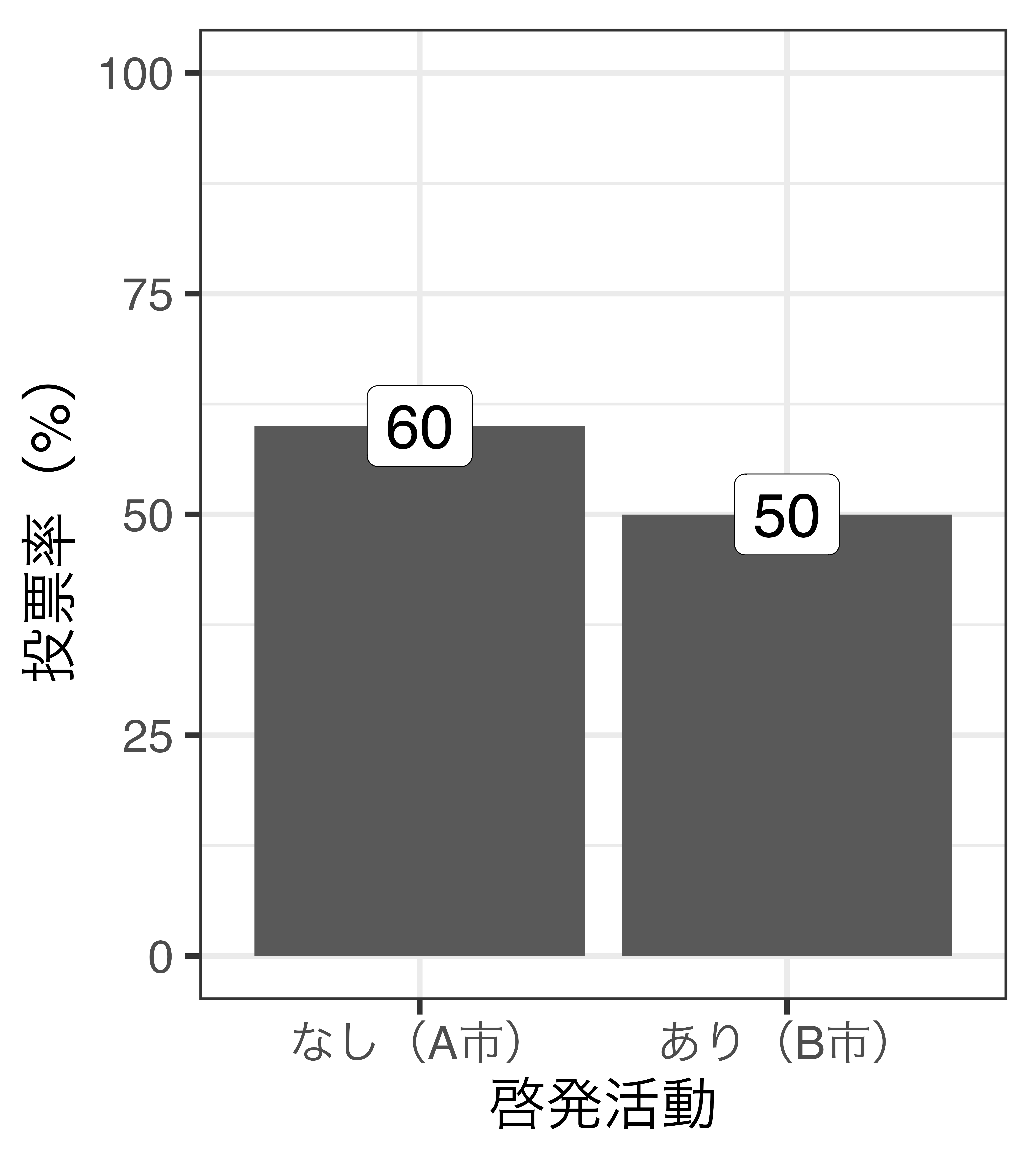 原因(\(X\))と結果(\(Y\))の関係:啓発活動と投票率の関係(架空の例)