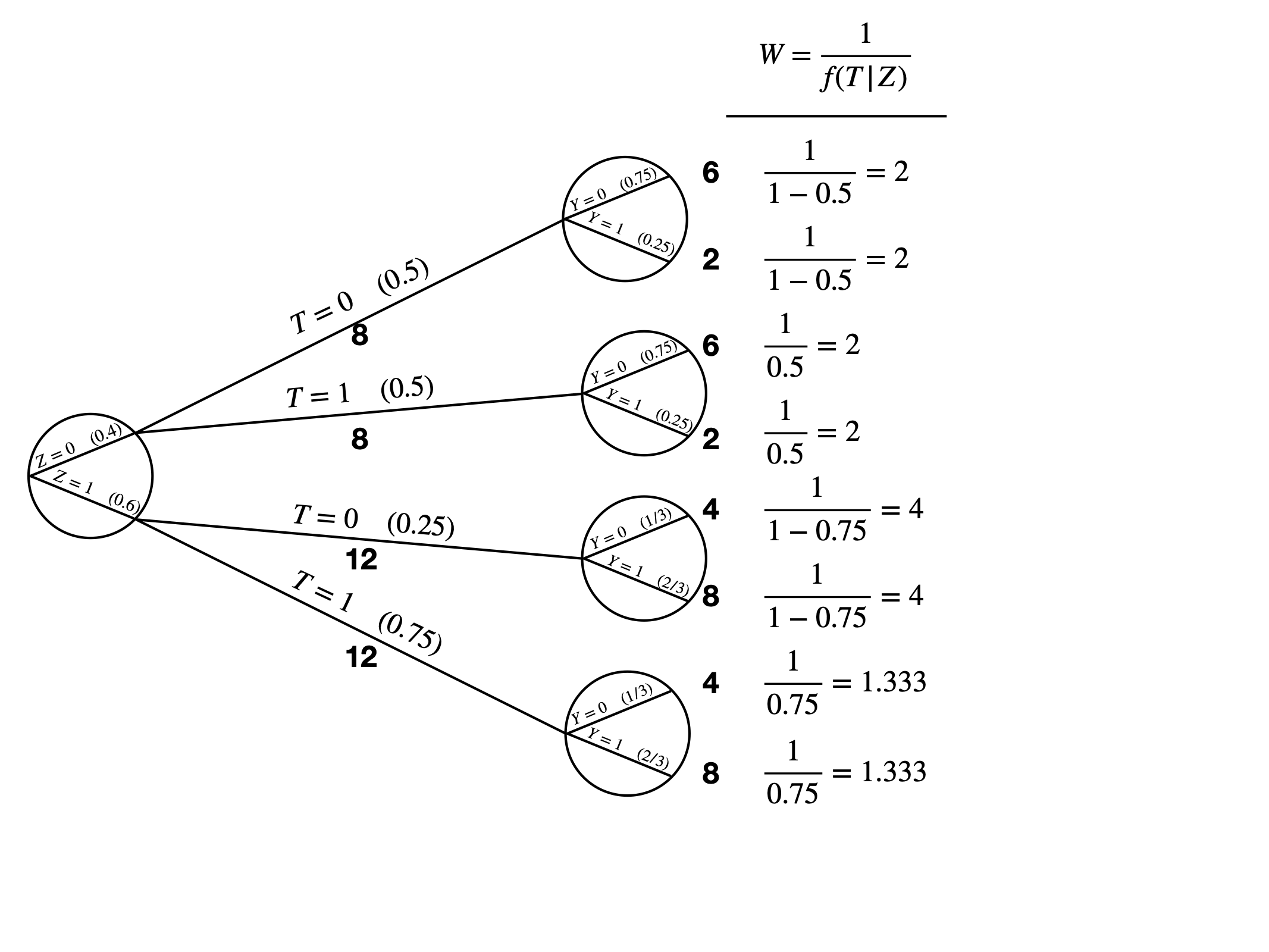 Wの和: 20Wの和: 20Wの和はサンプルサイズと一致する| ID (i) | Zi | Ti | Y0, i | Y1, i | ei | Wi |
