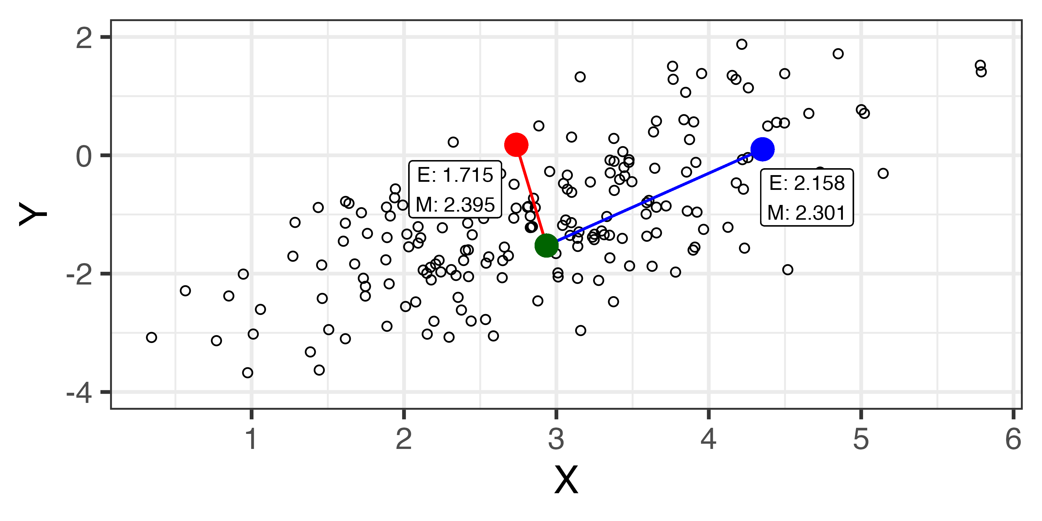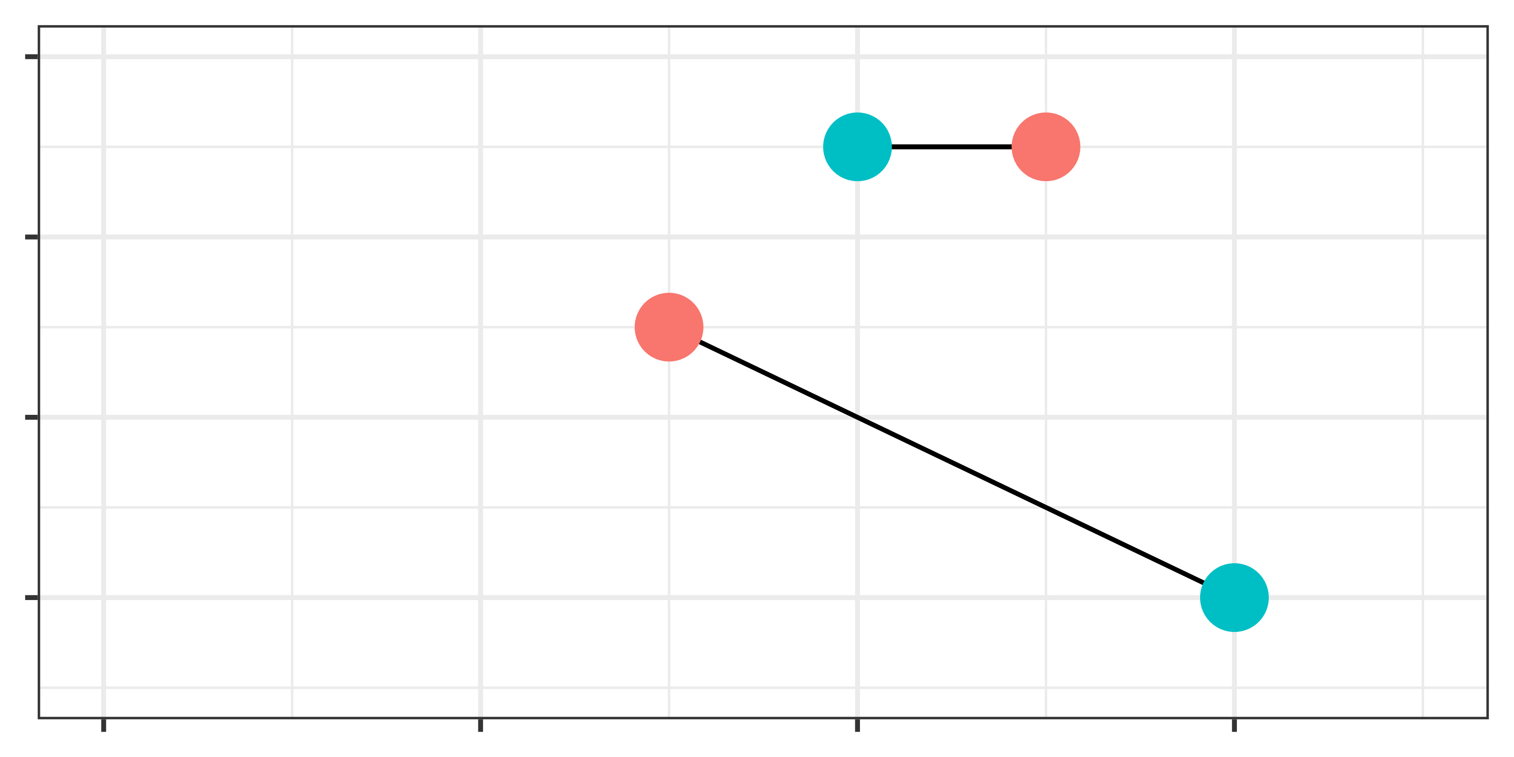 \[\begin{align}\text{ATE} & = \frac{N_\text{Treat}}{N_\text{All}}\text{ATT} + \frac{N_\text{Control}}{N_\text{All}}\text{ATC} \\ & = \frac{11}{24} 1.818 + \frac{13}{24} 3.923 = 2.958\end{align}\]