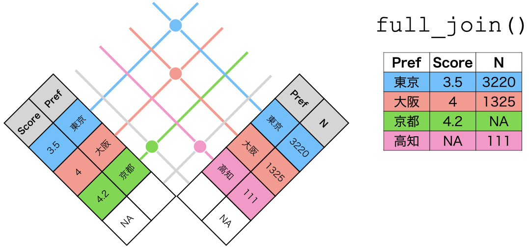 full_join()の仕組みfull_join(データ1, データ2, by = "識別用変数名")