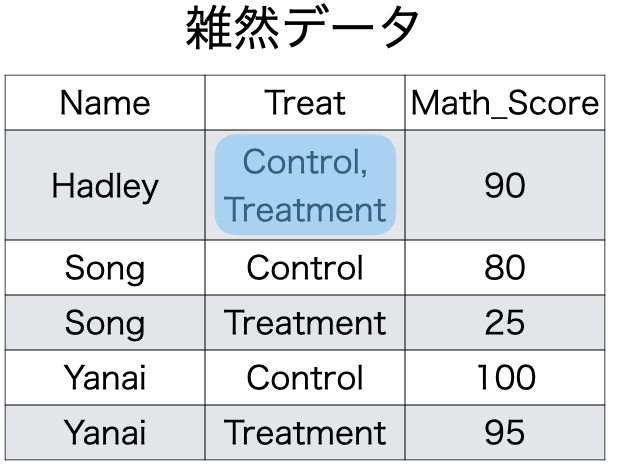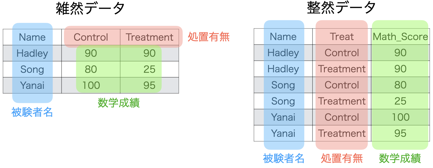 by = c("識別用の変数名1", "識別用の変数名2")Tidy data:Hadley Wickhamが提唱したデータ分析に適したデータ構造