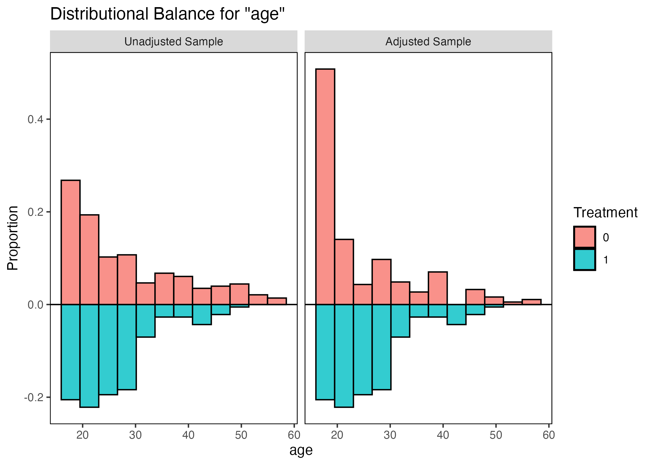 このようにヒストグラム(棒グラフ)を使うと、一つ一つの変数の図が必要となってくるので、実際の論文には掲載しにくい。それでも分析の段階では一つ一つのバランスを詳細に見ることは重要である。たとえば、傾向スコアマッチングの場合、回答者の年齢(age)のバランスは改善されている。本当にそうだろうか。ageのバランスを確認してみよう。