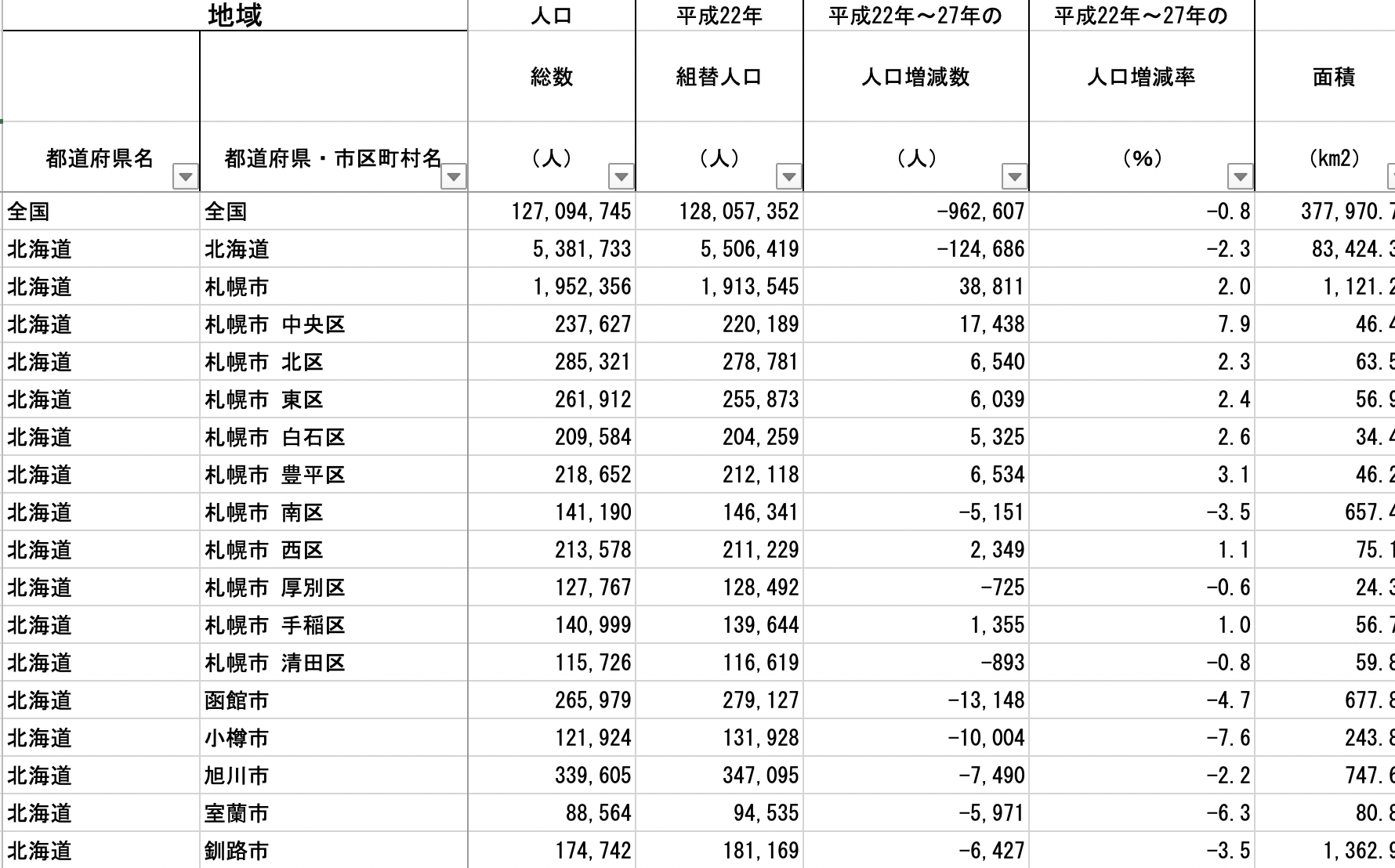 最後の原則4は1つの表は1単位を表すことである。実は1つの表に複数の分析単位が含まれるケースがかなり多い。以下の図は政府統計の例であるが、1つの表に「国」、「都道府県」、「市区町村」、「行政区」の単位が混在していることが分かる。