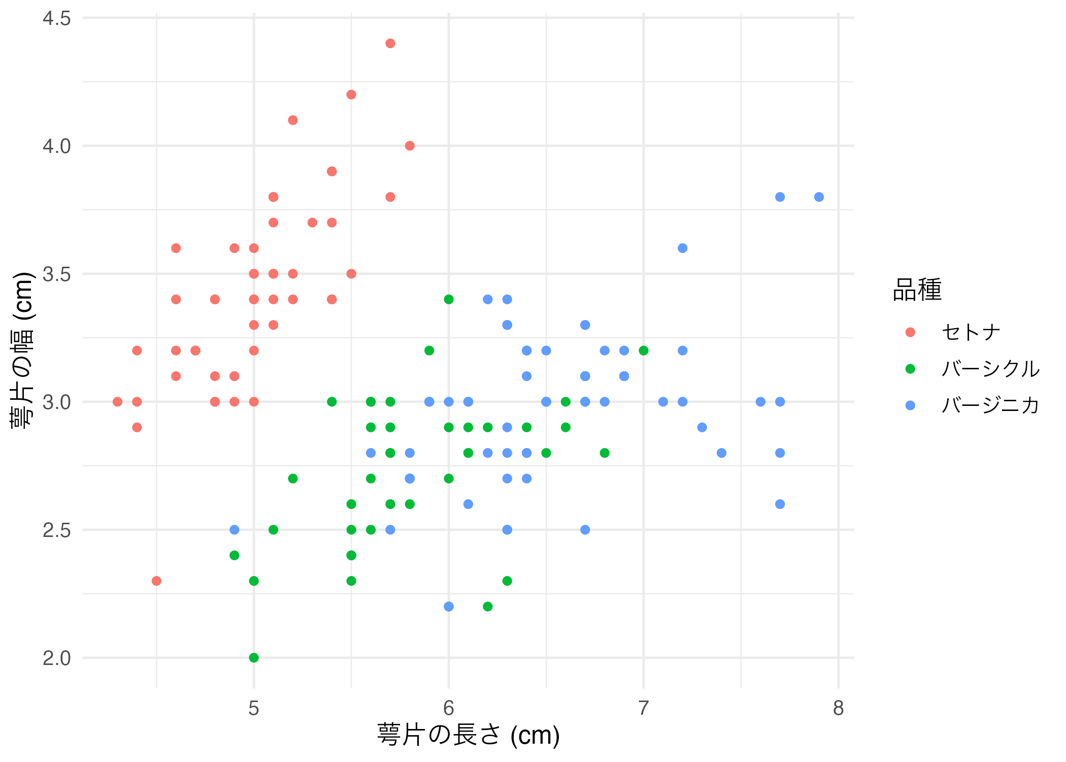labs(x = "萼片の長さ (cm)", y = "萼片の幅 (cm)", color = "品種") +