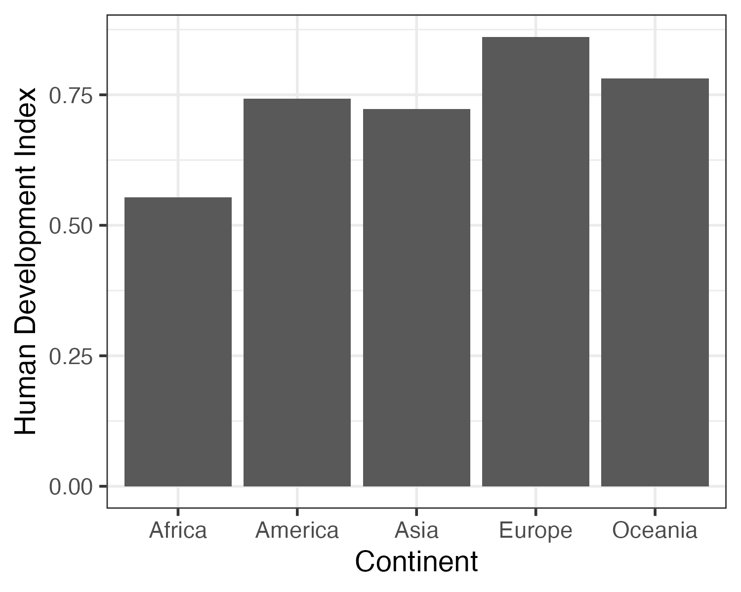 棒グラフに必要な2つの変数が揃った。ただし、データがこの2つの変数のみで構成される必要はない。含まれていれば問題ない。それでは作図に移ろう。棒グラフを作成するときに使用する幾何オブジェクトgeom_col()である。また、aes()内に指定するマッピングは棒の横軸上の位置を意味するxと棒の高さを意味するyである。そして、棒の横軸上の位置は大陸(Continent)、棒の高さは人間開発指数の平均値(HDI)なので、マッピングはx = Continent, y = HDIとなる。もし、図 1 (b) のような図を作成するなら、xとyを逆にすれば良い。