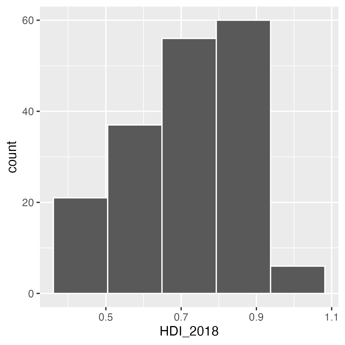 それでも見た目は棒グラフと非常に似ているため、それぞれの棒には棒の横軸上の位置と高さという情報が含まれている。ただし、{ggplot2}を使ったヒストグラムの作成は非常に簡単である。{ggplot2}ではgeom_histogram()を使用するが、ヒストグラムを出力する変数をxにマッピングするだけで、棒の高さは自動的に計算される。つまり、yに対してマッピングを行う必要はなく、xのみで十分である。それではdf内の人間開発指数(HDI_2018)のヒストグラムを作成してみよう。