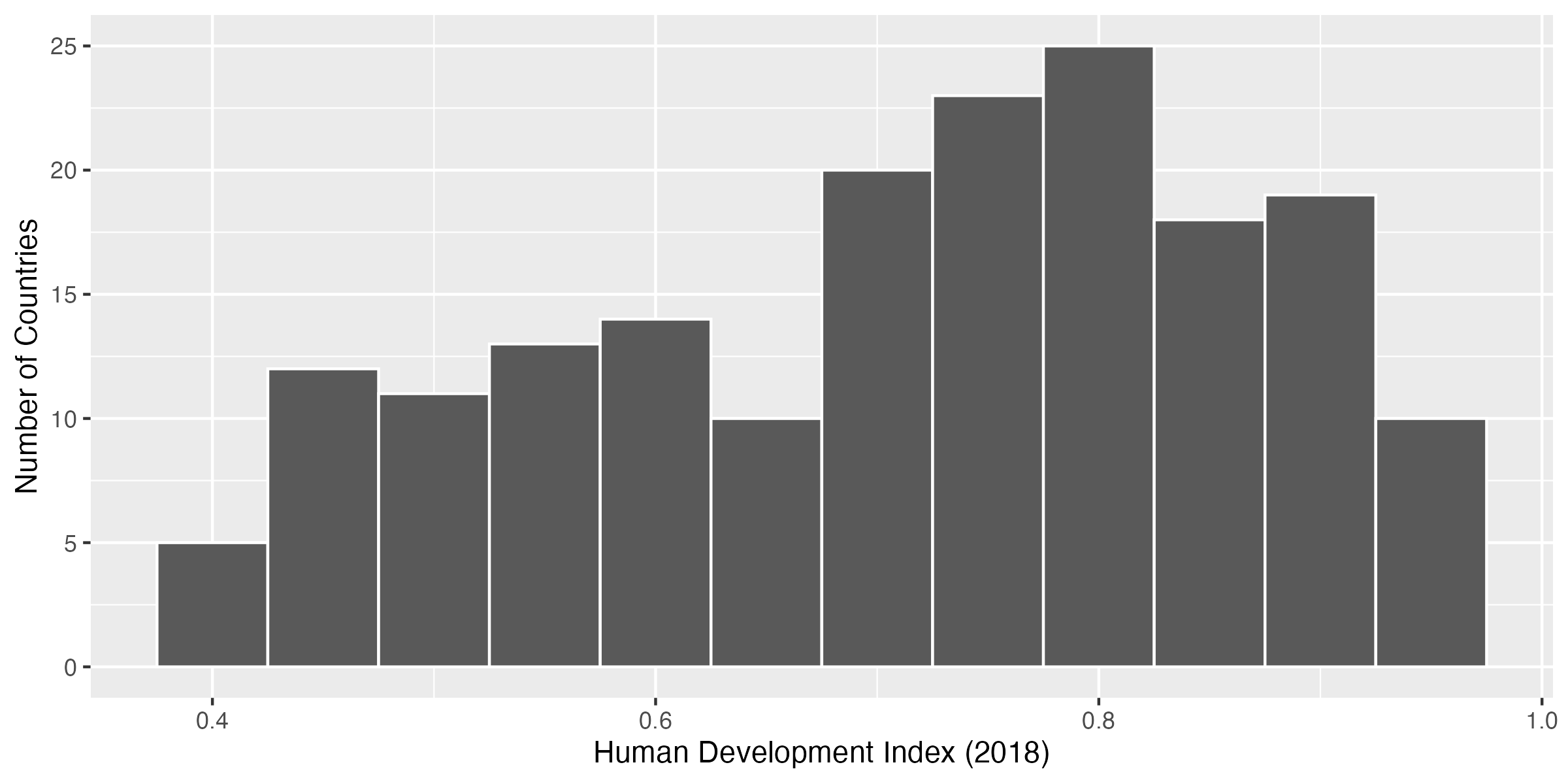 ヒストグラムの見た目は棒グラフと非常に似ている。棒グラフとヒストグラムの違いは棒と棒の間に隙間があるかないかである。棒グラフの場合は隙間がある。横軸が大陸の棒グラフの場合、アフリカとアジアの間の値というものは存在しない。なぜなら、名目尺度はそもそも数字でないか、数値であってもその数値の値に意味がないからだ。また、順序変数の場合、1位と2位の間の値は存在しない。つまり、1.5位といった順位は存在しない。一方、人間開発指数のような連続変数は0.1と0.2の間には無数の値が存在する。棒を並べるとしたら隙間なく棒を並べる必要があろう。