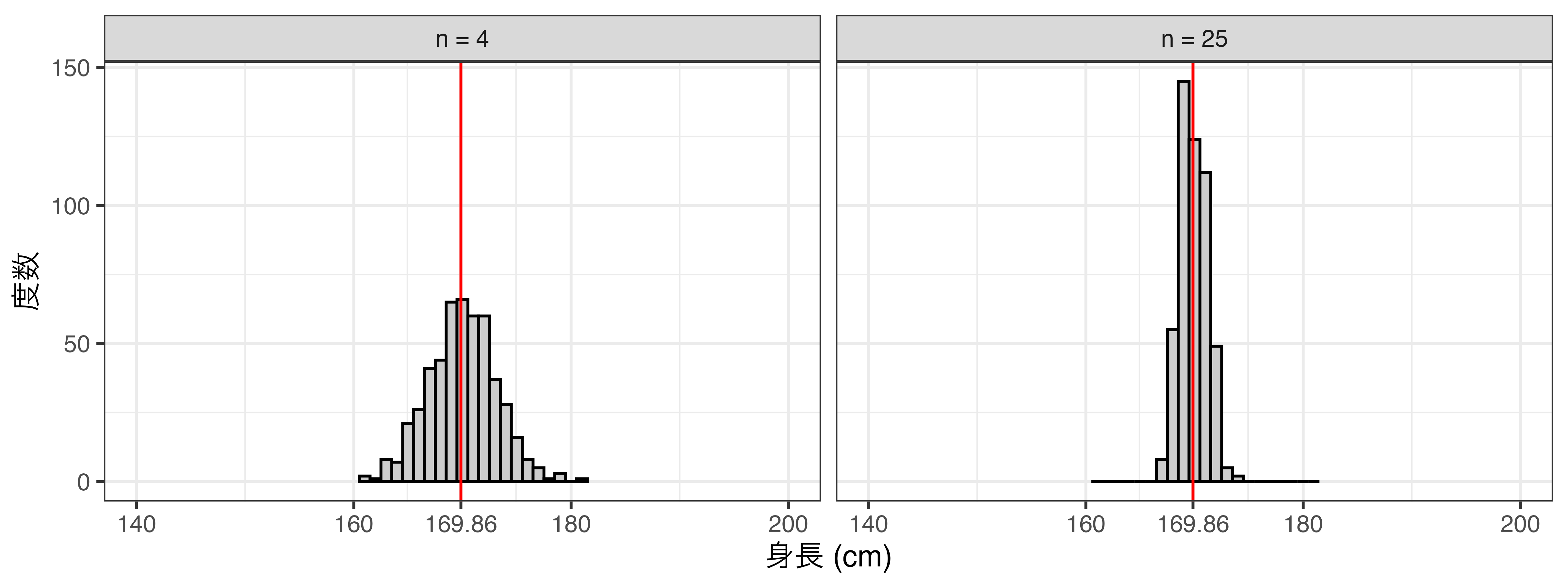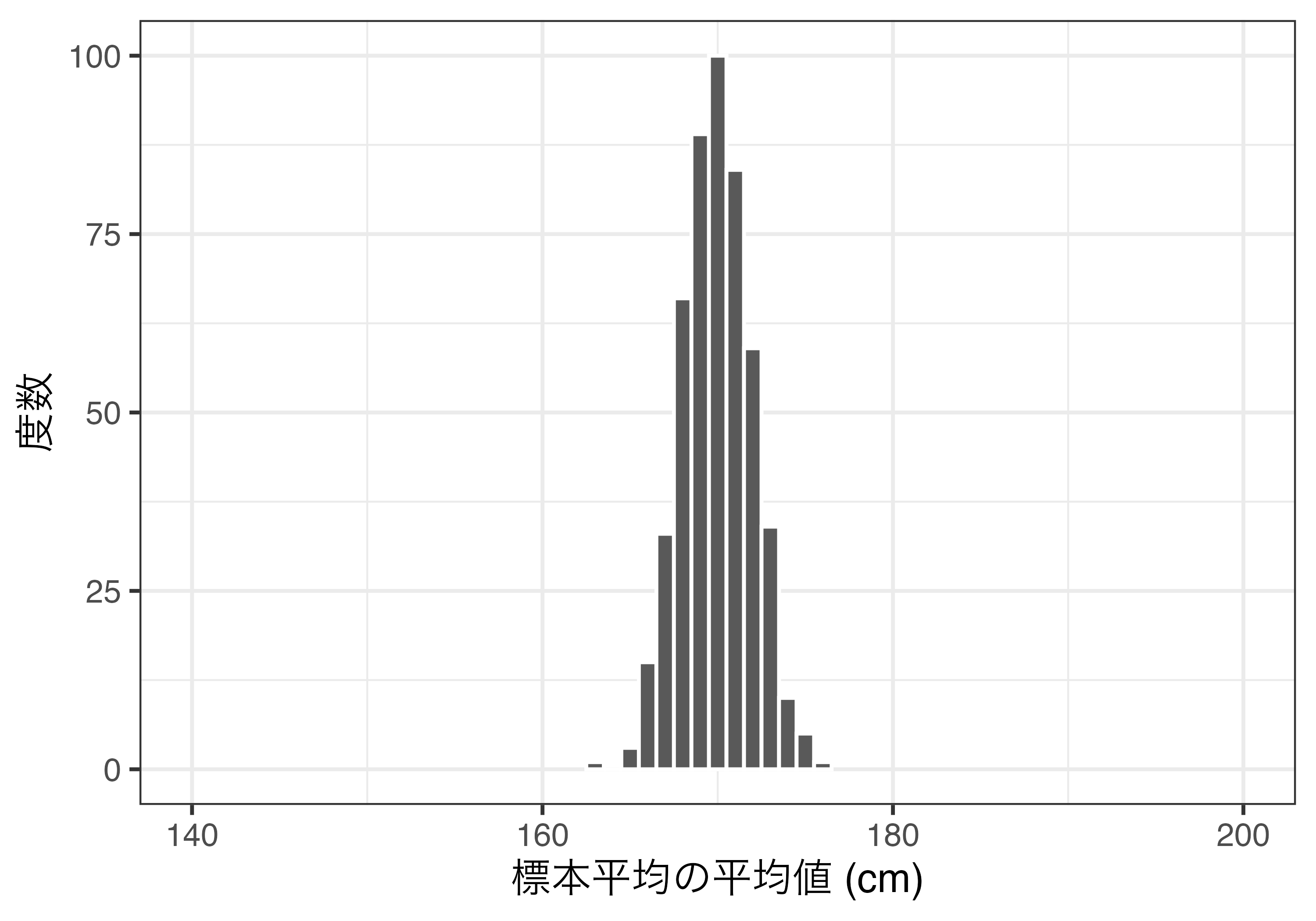 サンプルサイズが大きいほど、標準誤差も小さくなる(標本平均の平均値はいずれも約170.1)。