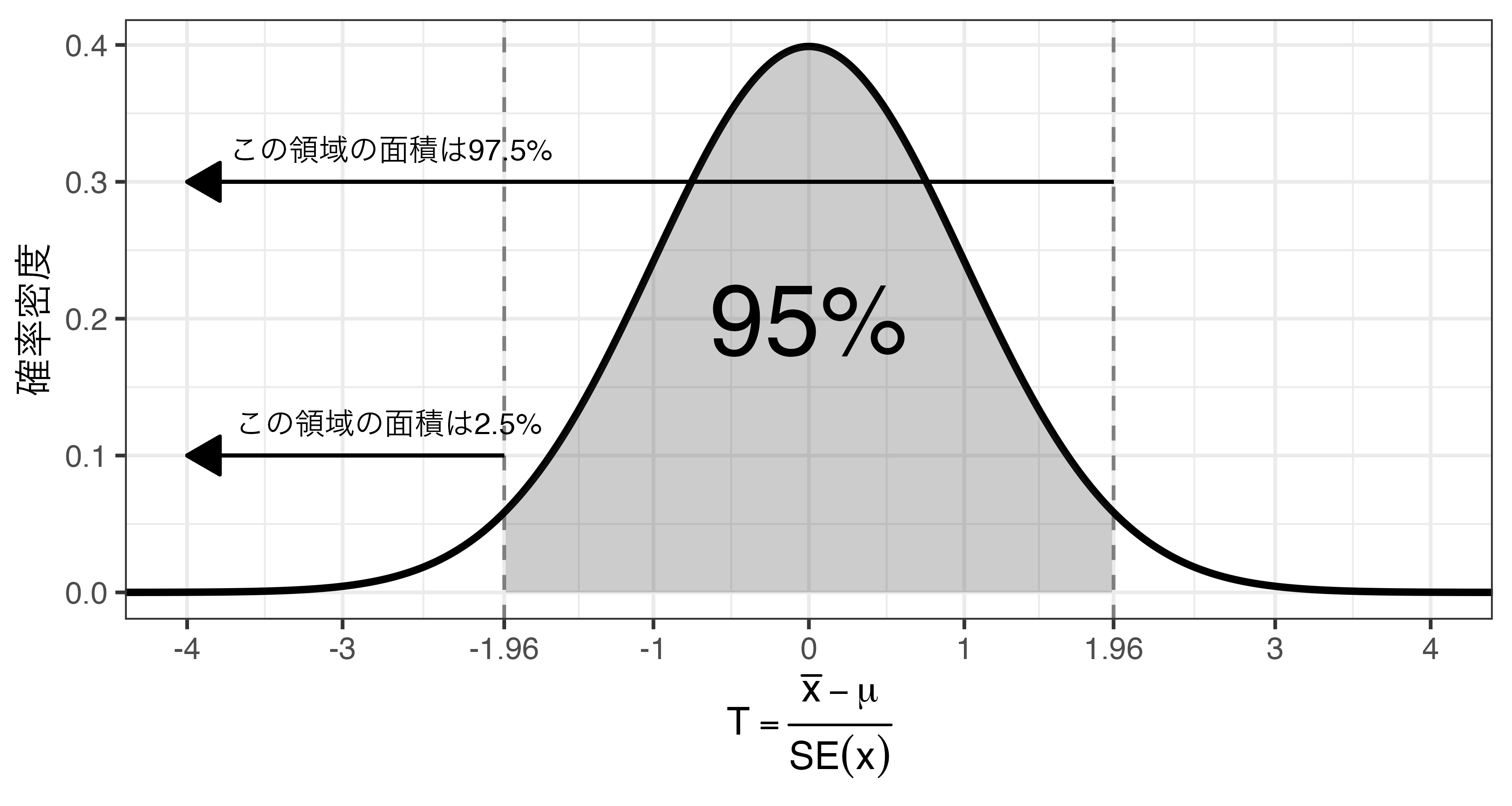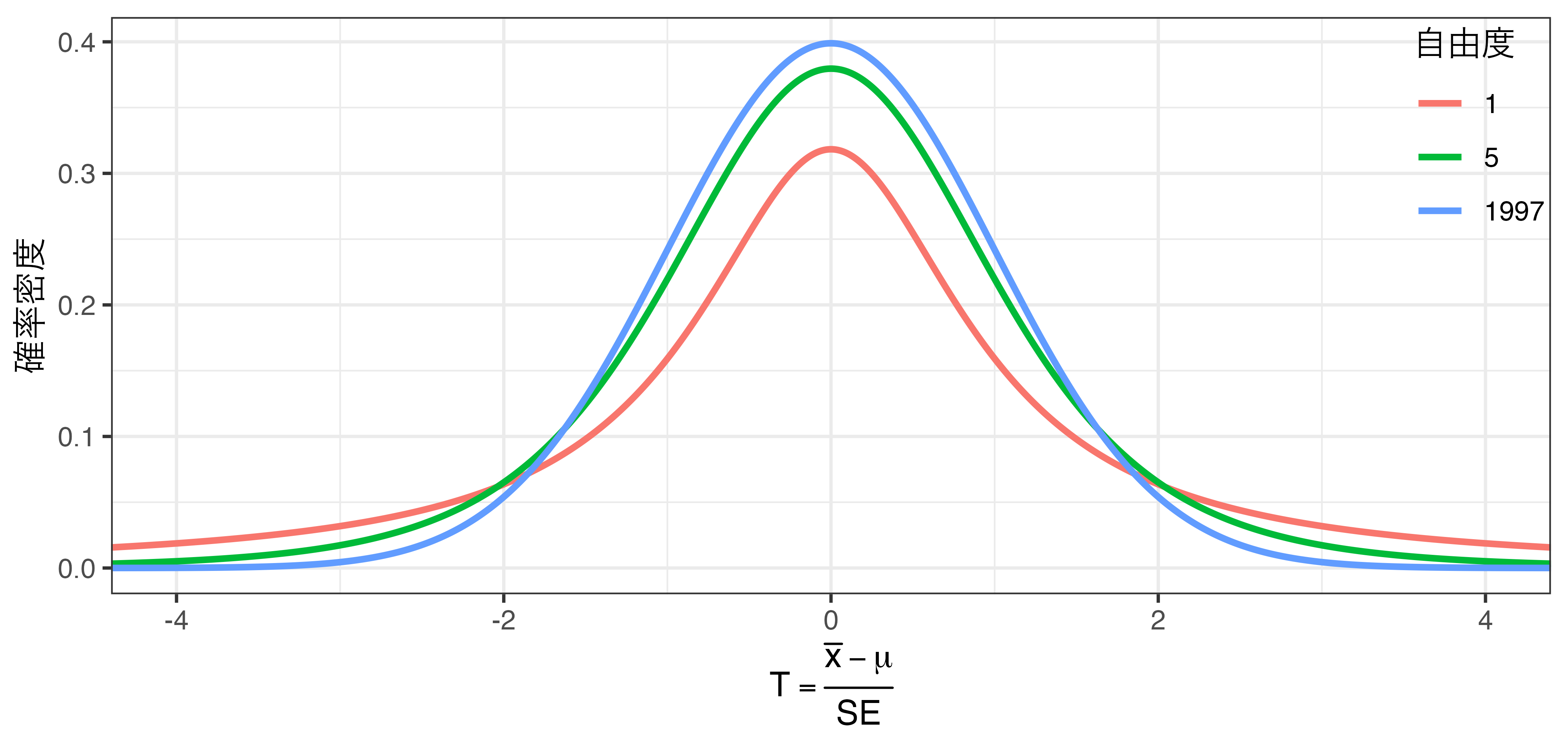 dfの\(t\)分布において\(t = \bigcirc\bigcirc\)なら\(t < T\)の領域の面積がp \(\times\) 100%となる、\(t\)の値を計算qt(0.025, df = 1997)とqt(0.975, df = 1997)で計算qt()内で0.025、0.975の代わりに\(\alpha / 2\) と \(1 - (\alpha / 2)\)を使用t.test(ベクトル名, conf.level = 区間)で推定