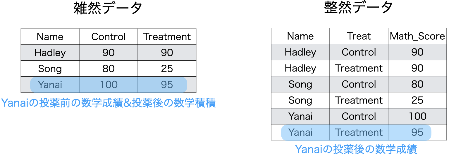 by = c("識別用の変数名1", "識別用の変数名2")Tidy data:Hadley Wickhamが提唱したデータ分析に適したデータ構造
