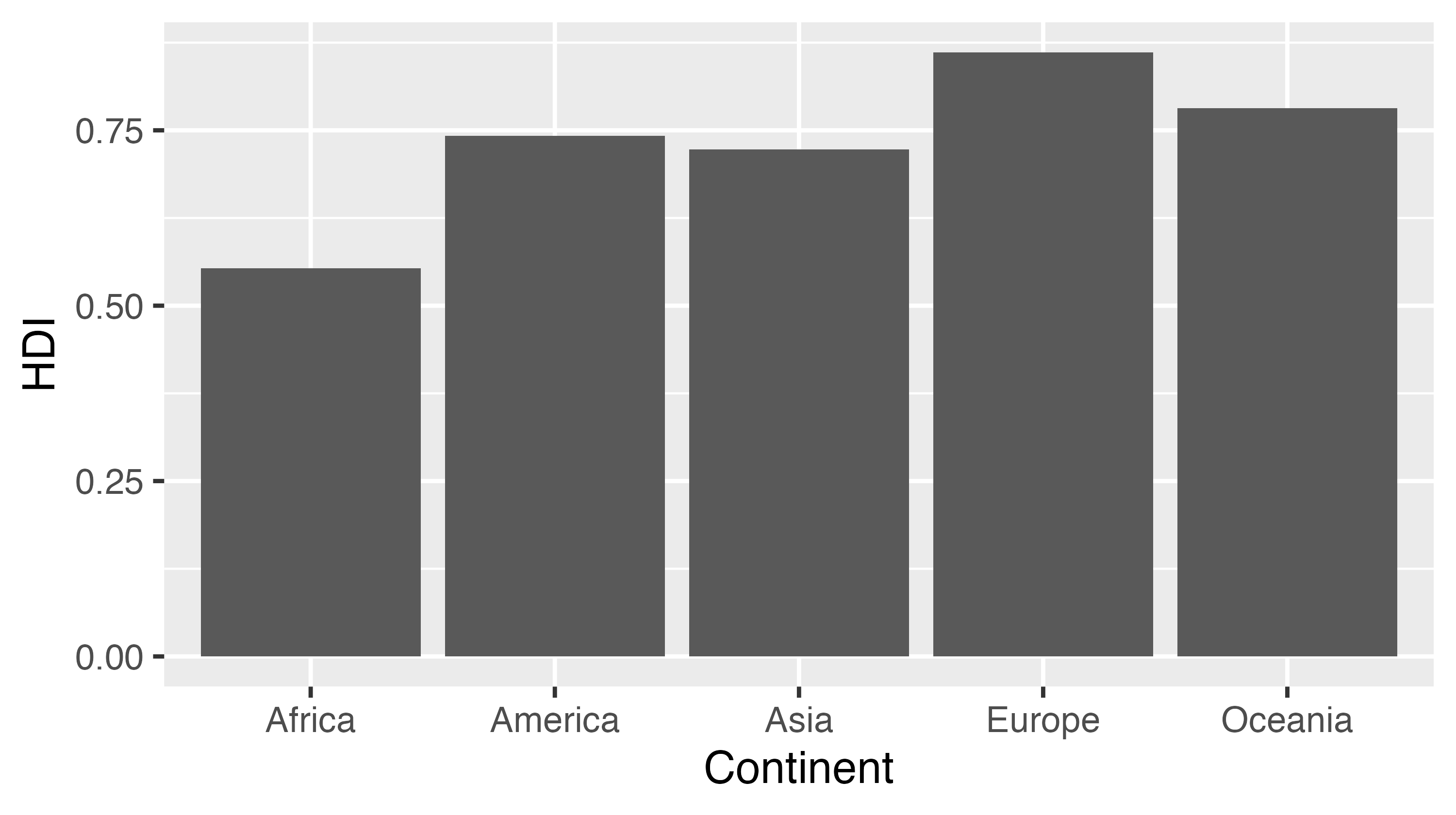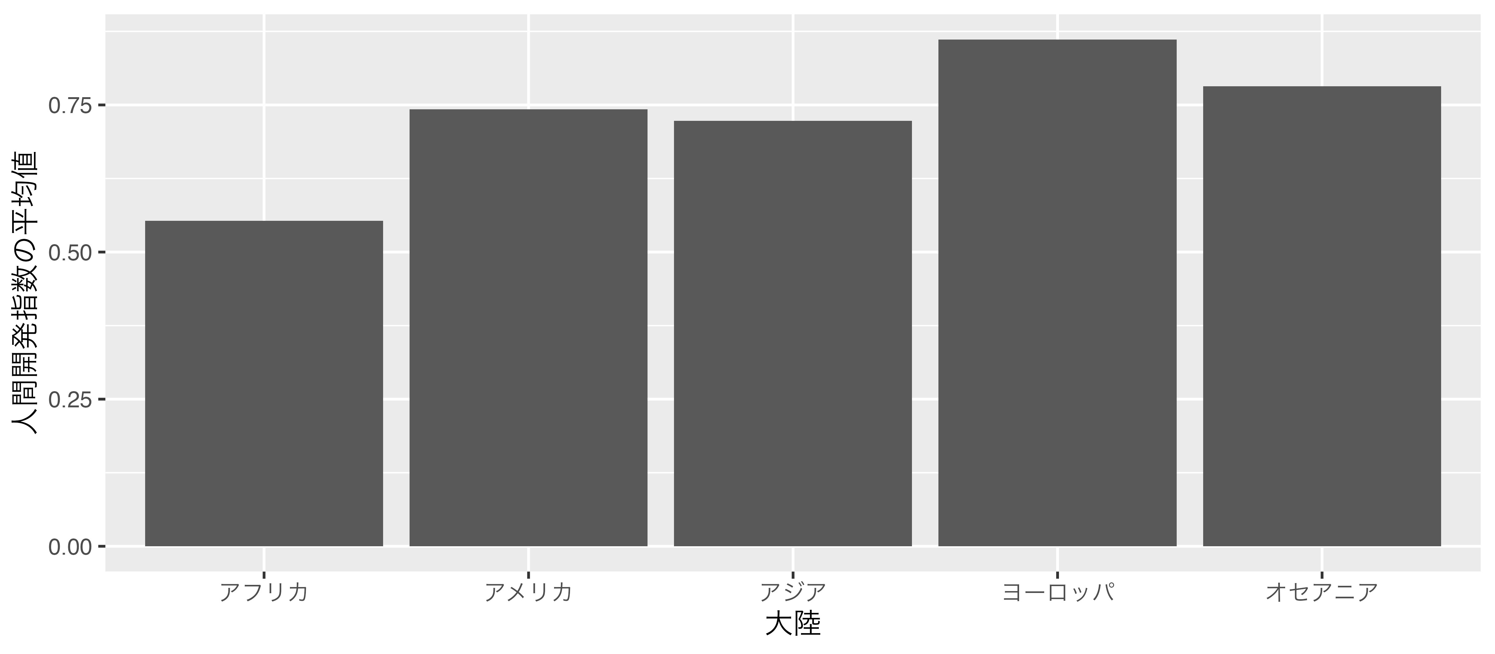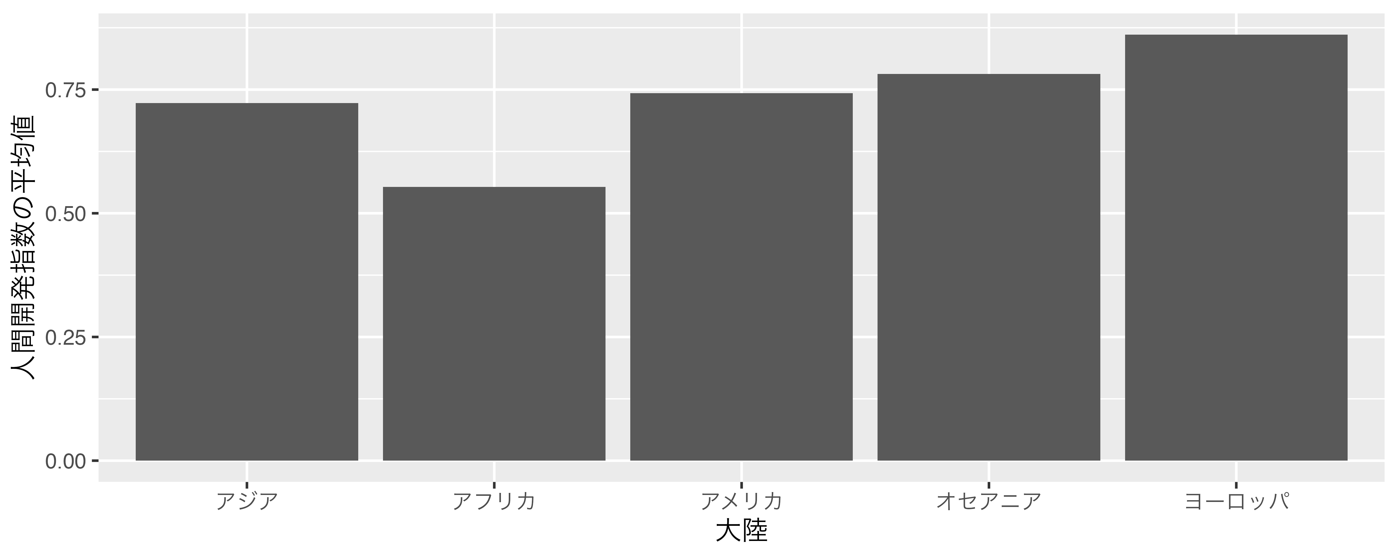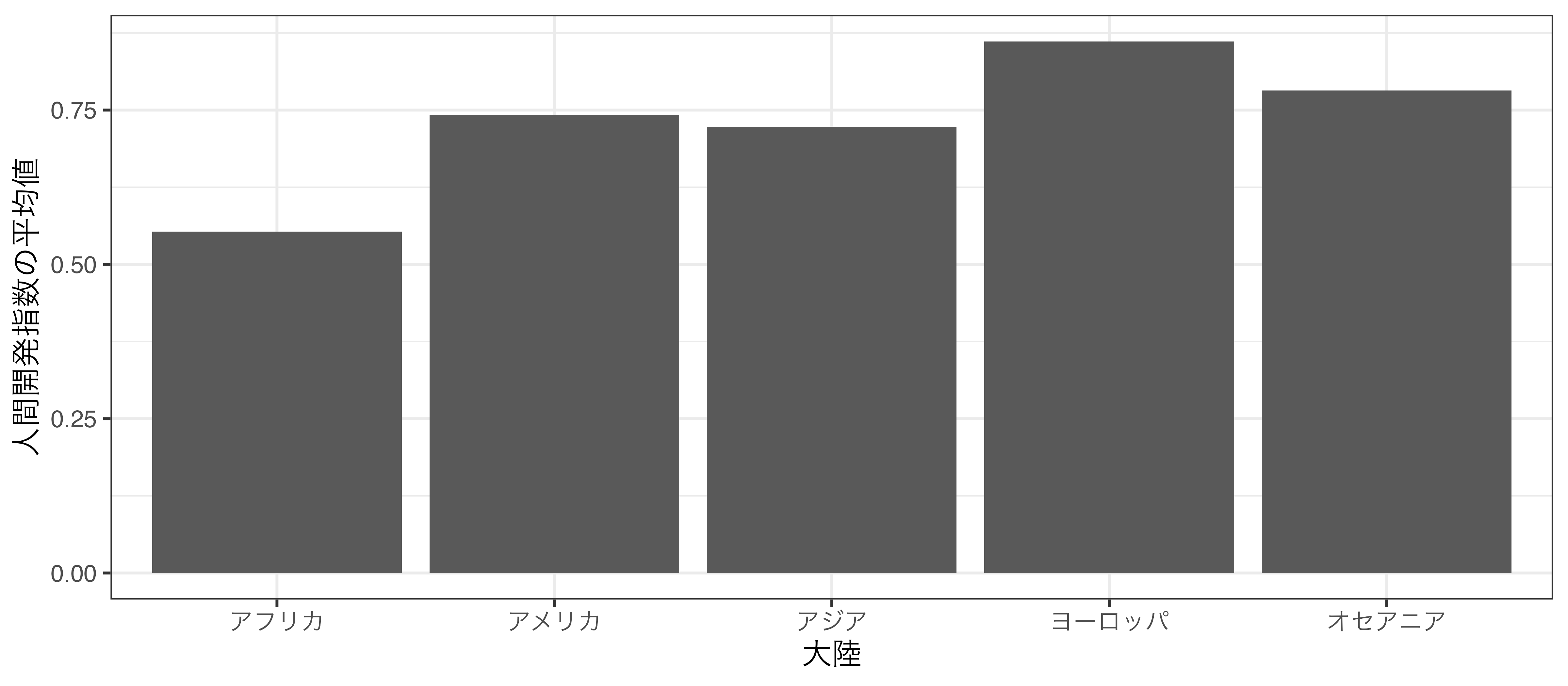 x: 棒の横軸上の位置 (大陸)y: 棒の高さ (人間開発指数の平均値)