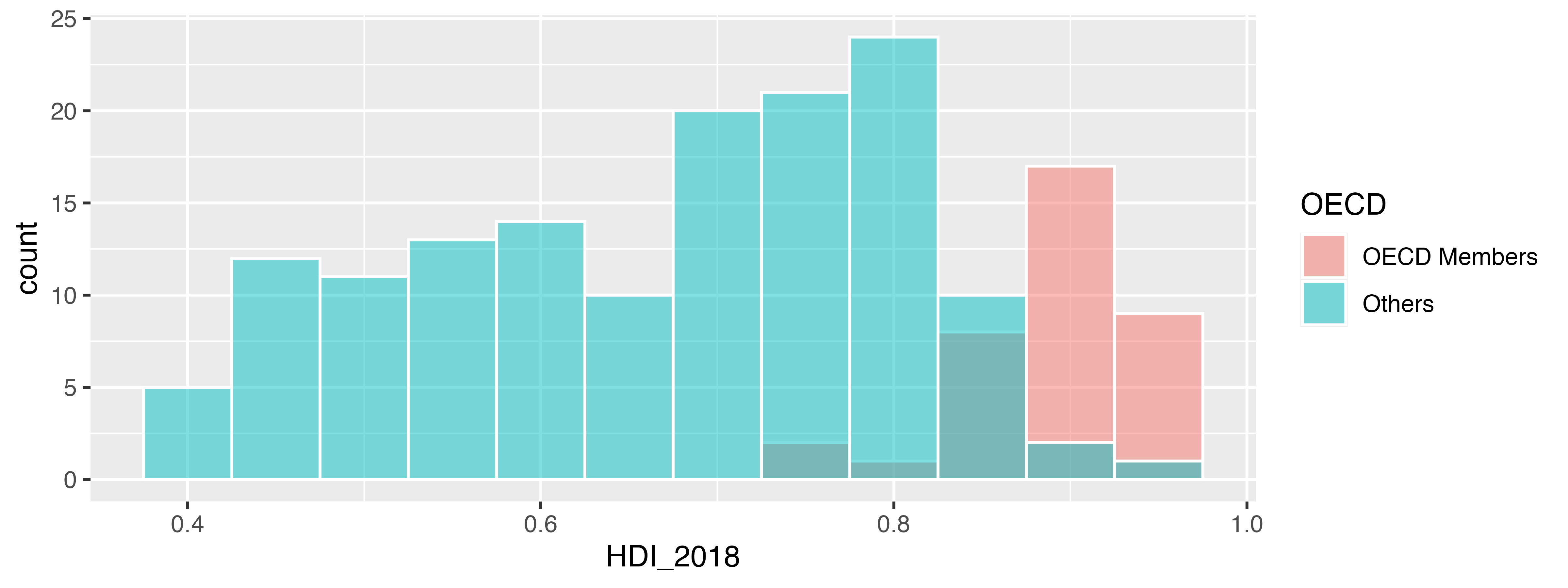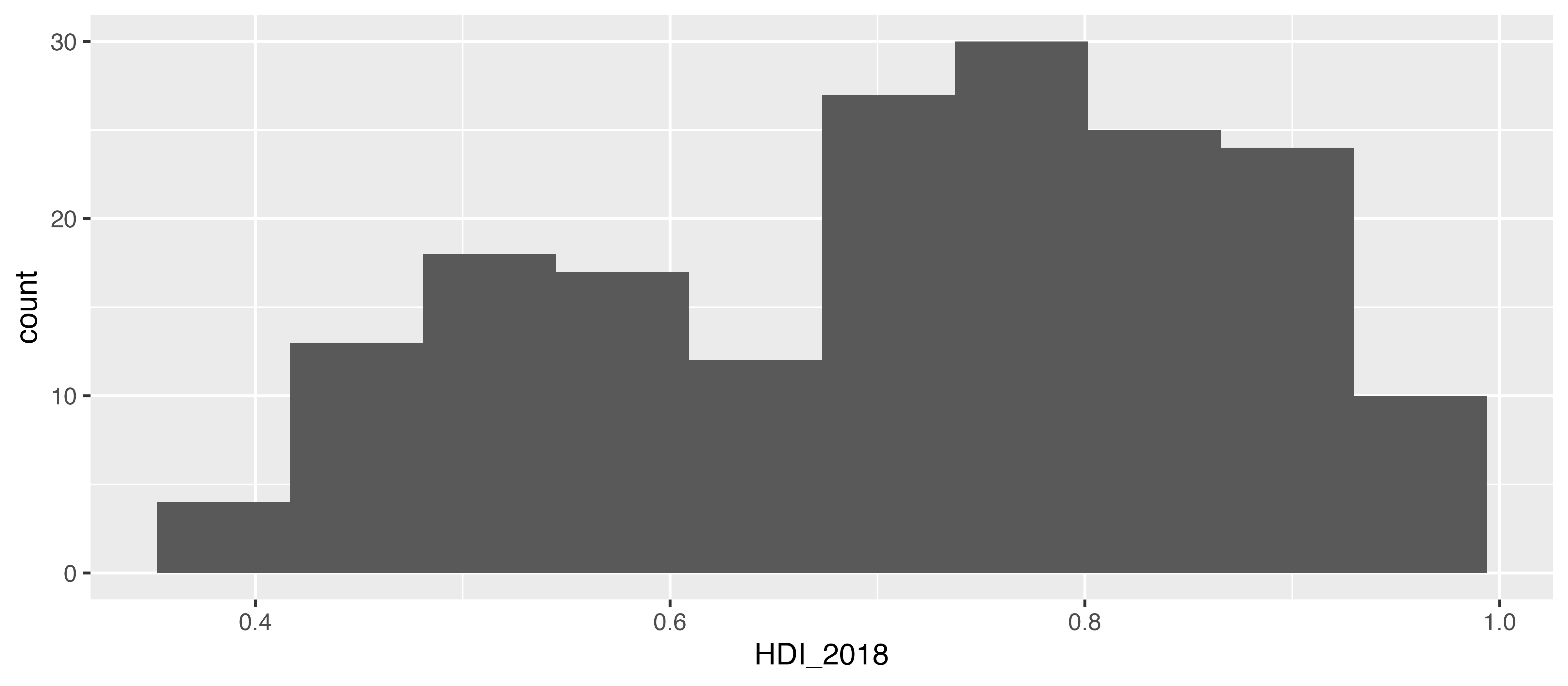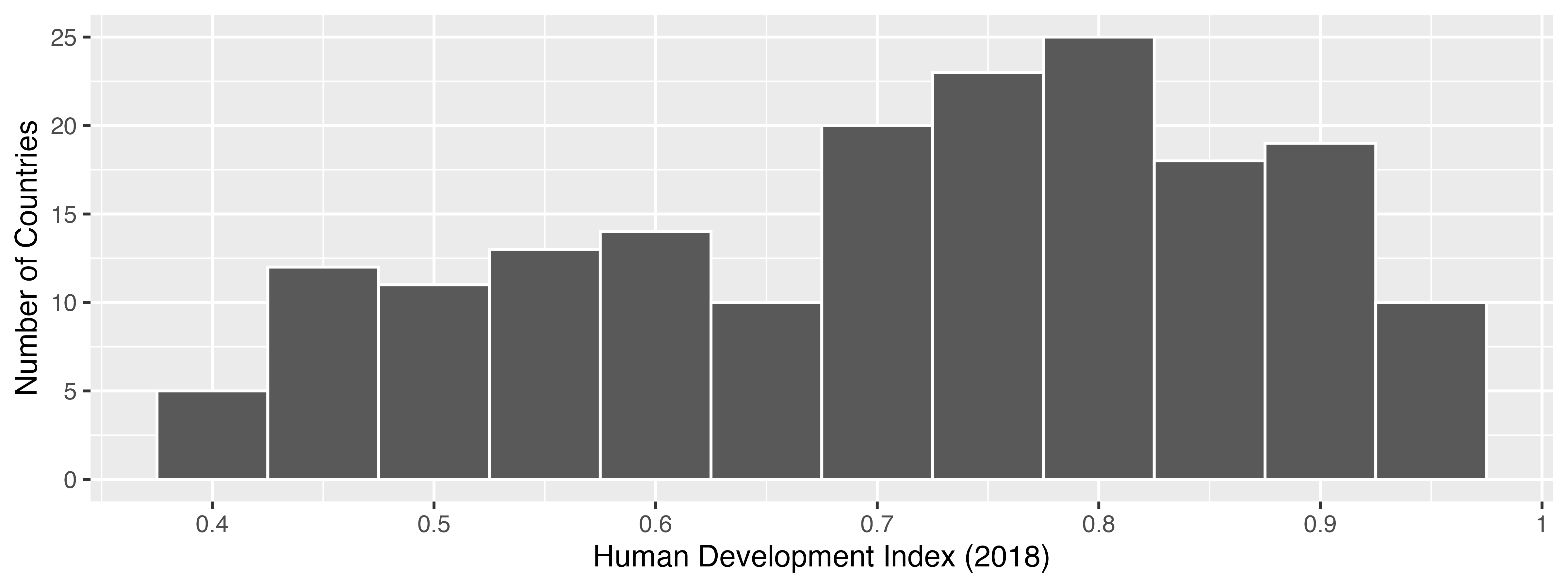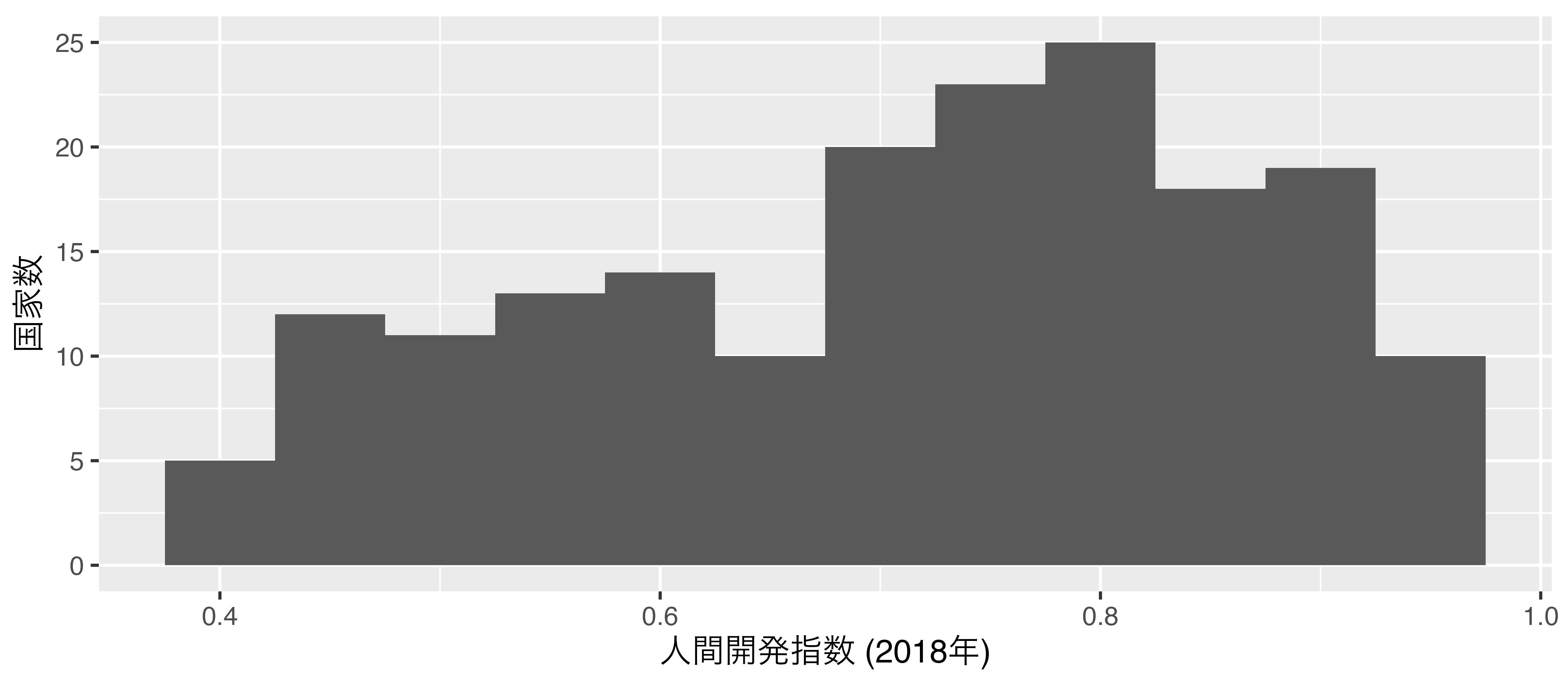 breaks引数: 目盛りの位置 / labels引数: 目盛りのラベル大陸ごとのHDI_2018のヒストグラム: ファセット分割を使用