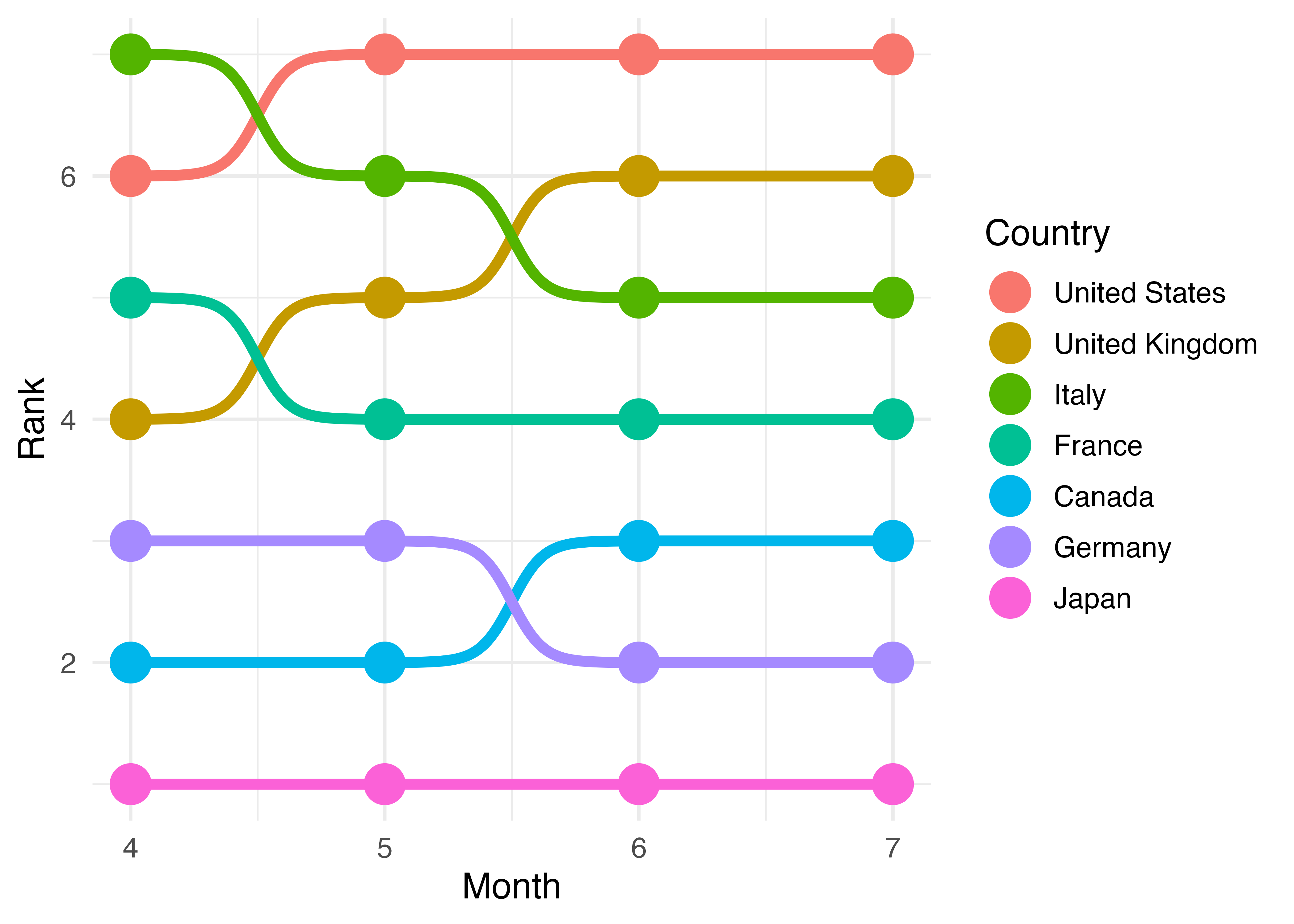 geom_bump()幾何オブジェクトが使えるようになります。{ggbump}を使用せず、{ggplot2}が提供するgeom_line()でも代替可能です。geom_line()の場合、直線で順位の変化が表示され、geom_bump()の場合は曲線で表示されます。丸い感じの図を好まない方なら、{ggbump}を読み込まず、geom_bump()をgeom_line()に書き換えてください。↩︎今回は2期間の変化を示していますが、3期以上の場合、