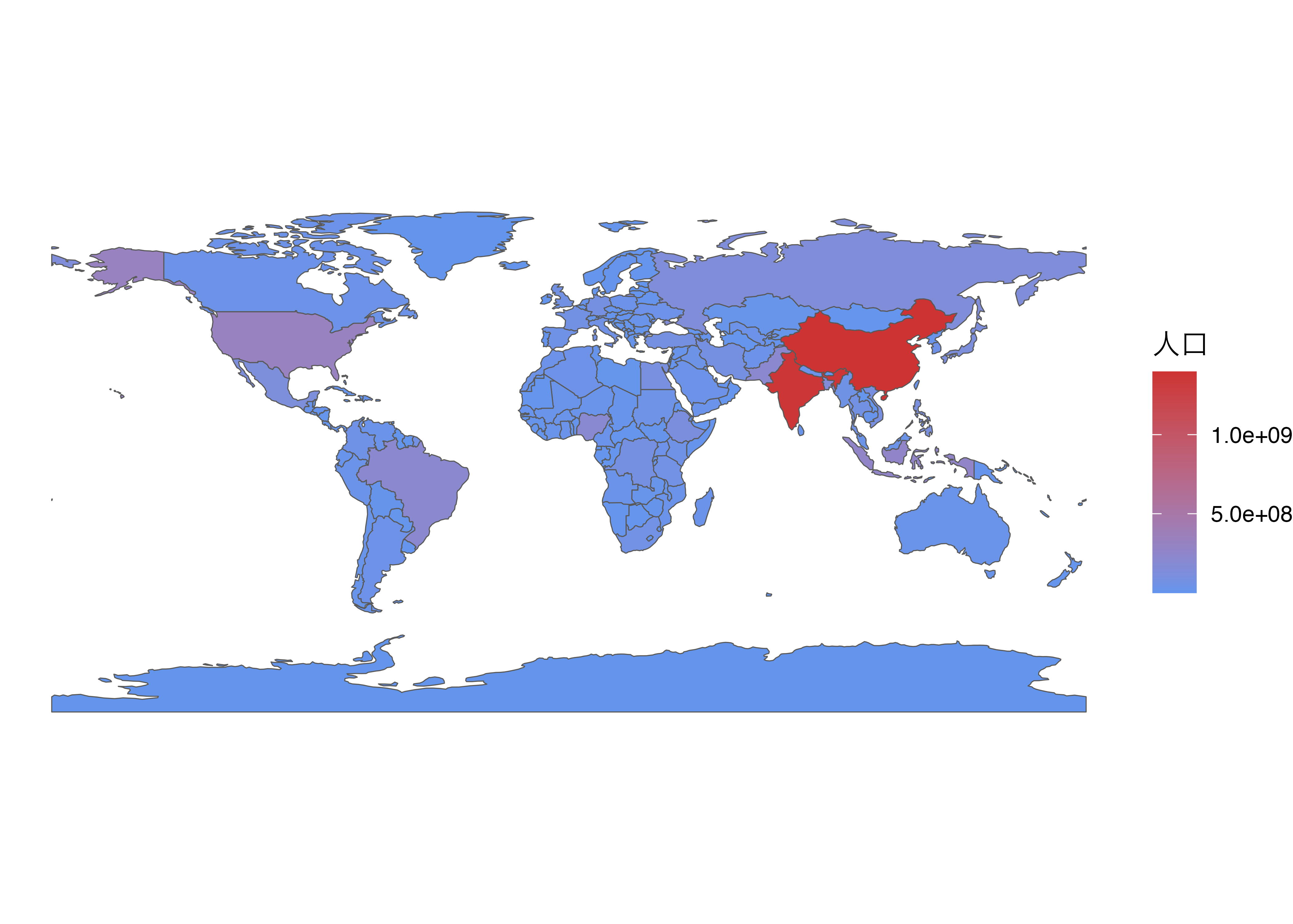 これでツリーマップが完成しました。インドと中国の存在感がかなり大きいですね。更にラベルのサイズを長方形に合わせると、その存在感をより高めることができます。ラベルの大きさを長方形に合わせるにはgeom_treepmap_text()の内部にgrow = TRUEを指定します。