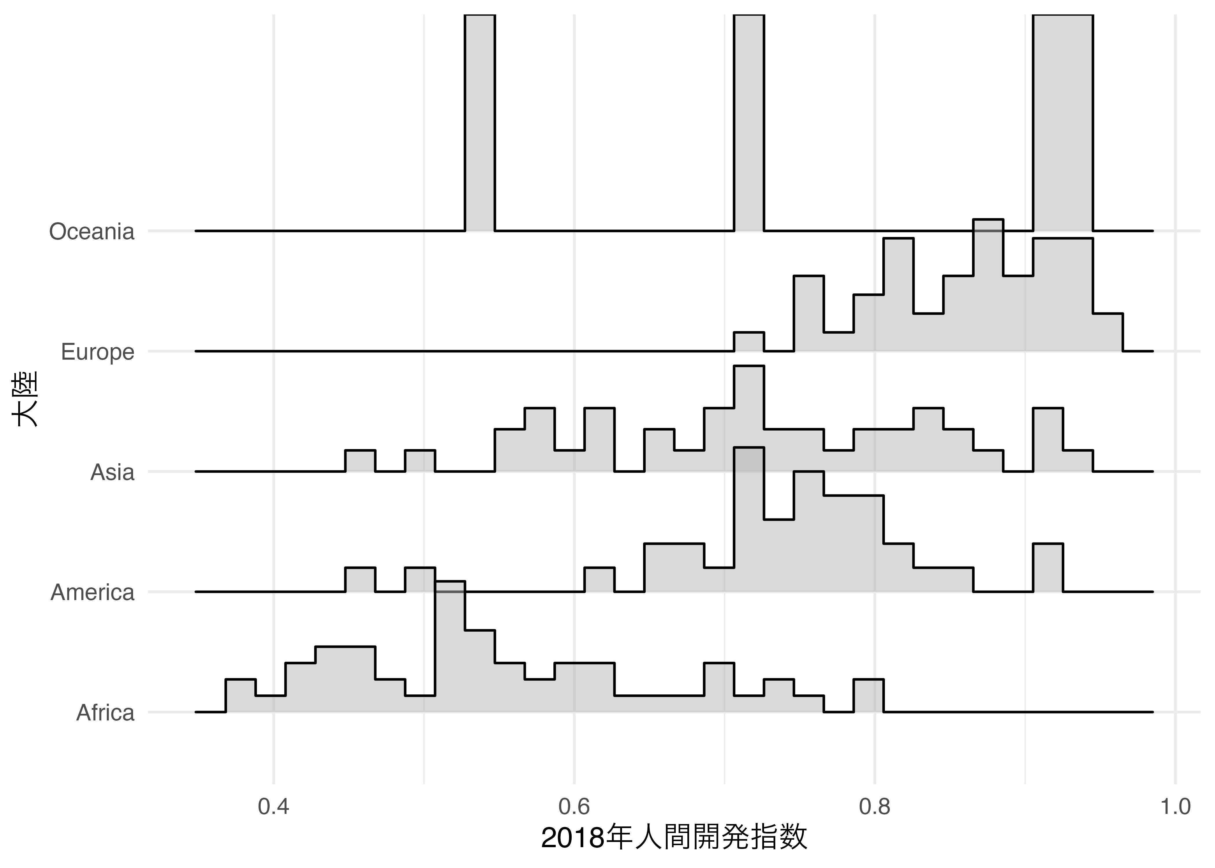 リッジプロット(ridge plot)はある変数の分布をグループごとに出力する図です。大陸ごとの人間開発指数の分布を示したり、時系列データなら分布の変化を示す時にも使えます。ここでは大陸ごとの人間開発指数の分布をリッジプロットで示してみましょう。