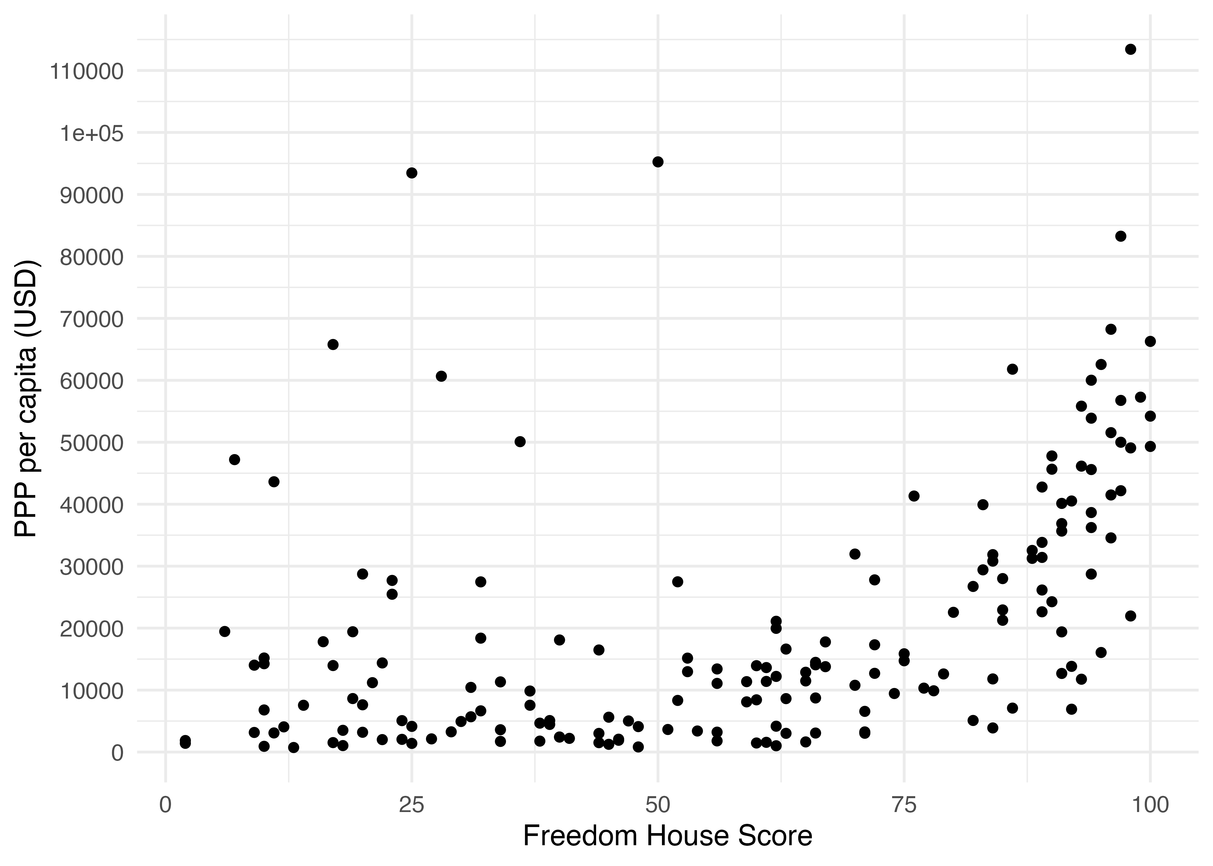\[ \text{PPP per capita} = \beta_0 + \beta_1 \cdot \text{FH}\_\text{Total} + \varepsilon \]